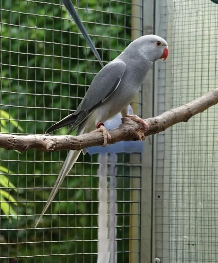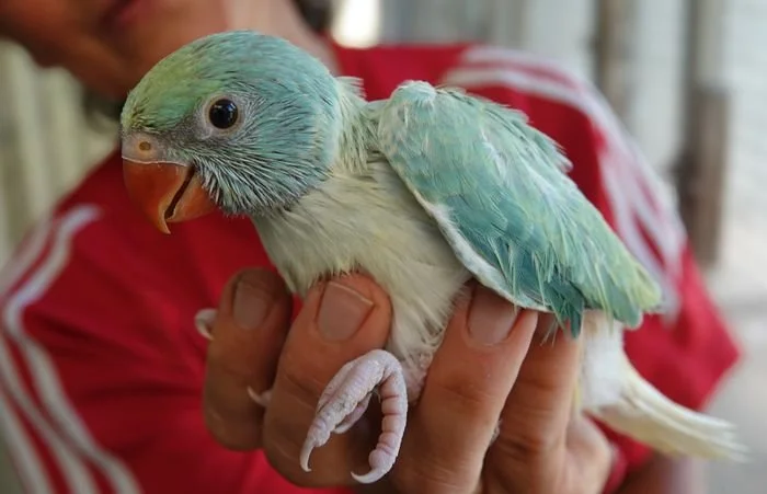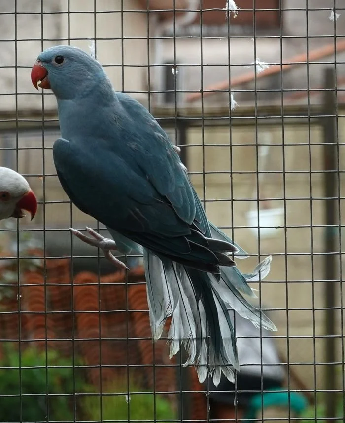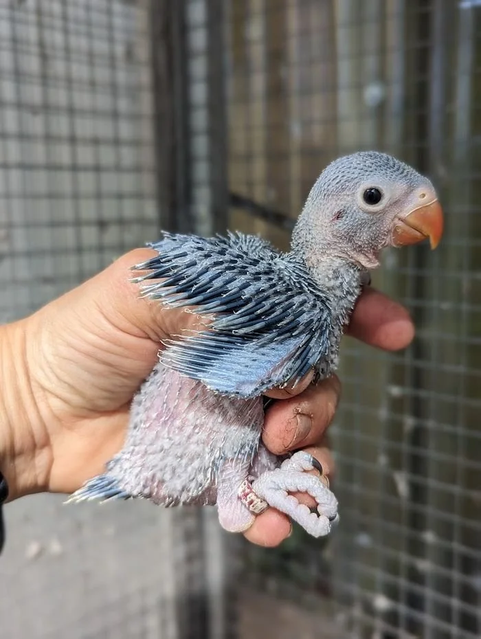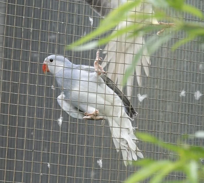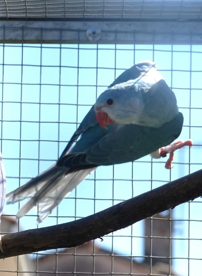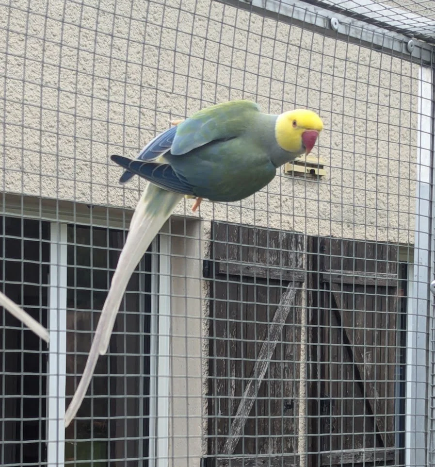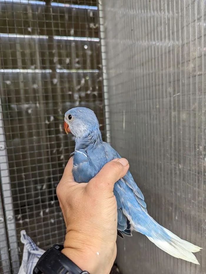 19 mai: on a fait sexer nos jeunes perruches à collier, ici, une femelle bleu porteuse de cleartail .