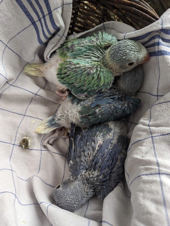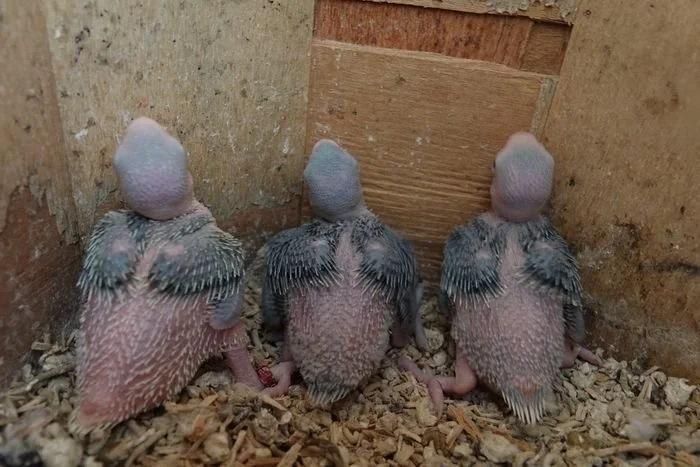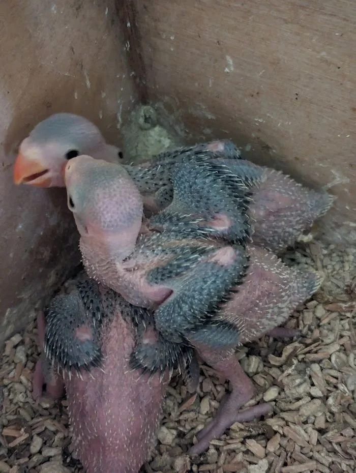 6 avril: les 3 jeunes perruches sont au nid, le bleu porteur de cleartail, le cleartail bleu et le cleartail vert .